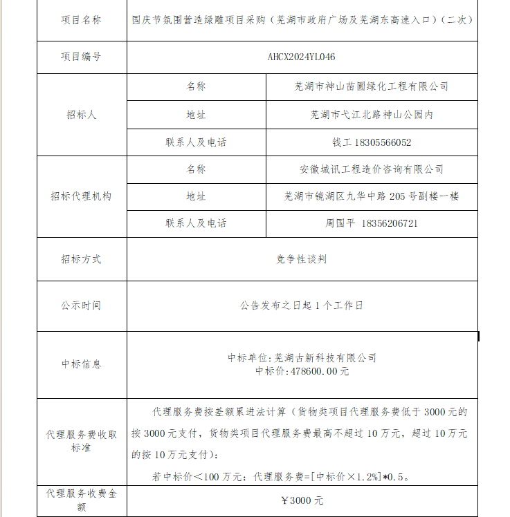 國慶節氛圍營(yíng)造綠雕項目采購(蕪湖市政府廣場(chǎng)及蕪湖東高速入口)(二次)中標...