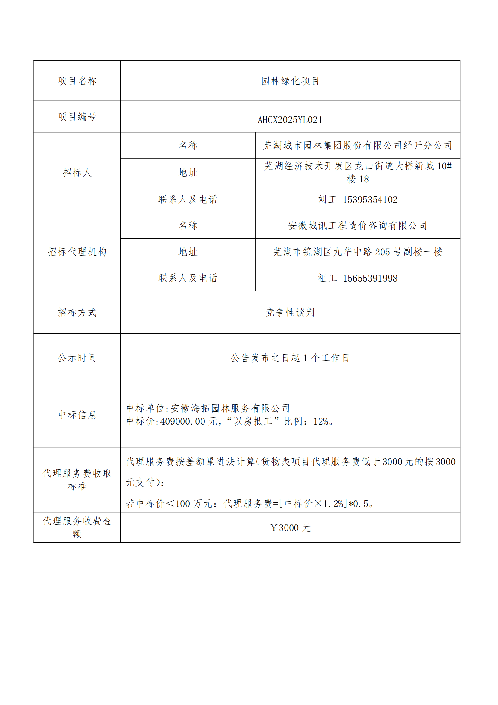 園林綠化項目成交結果公告