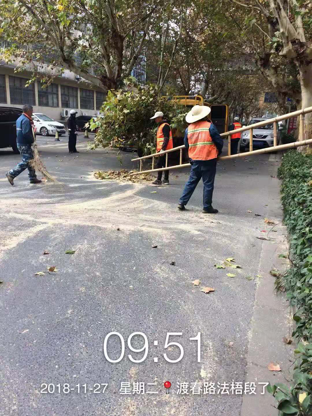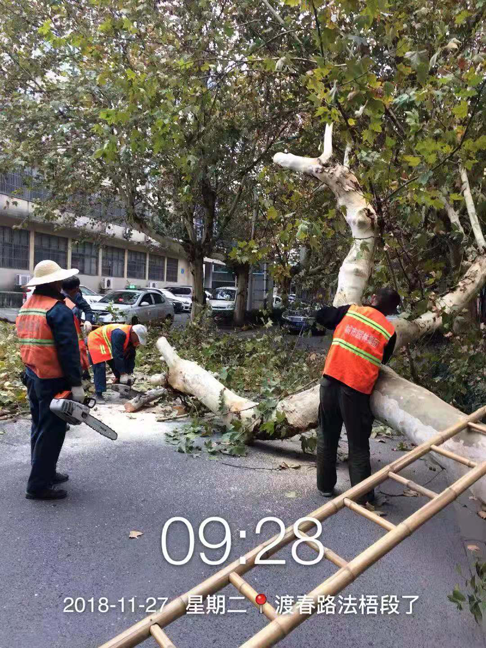 11月27日上午8時(shí)40分,渡春路上一棵有著(zhù)多年歷史的高大法梧突然傾倒。上午9時(shí)左右接到110報警平臺電話(huà),我們 當時(shí)即組織20多位施工人員并調配3輛搶險車(chē)及時(shí)趕到出事現場(chǎng)。倒下的法梧樹(shù)已完全占據了機動(dòng)車(chē)道,幸運的是沒(méi)有砸到任何人員和車(chē)輛。為減少對路面的阻擋,我們先鋸斷倒在機動(dòng)車(chē)道上的法梧樹(shù)的枝干、樹(shù)樁,然后依次裝到搶險車(chē)上運走。鏡湖交警大隊八中隊的交警們維持秩序,引導車(chē)輛從道路南側繞行。經(jīng)過(guò)半小時(shí)搶險,道路已經(jīng)暢通了。