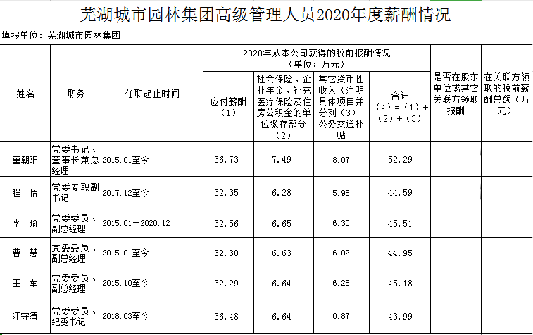 2020年度蕪湖城市園林集團企業(yè)負責人薪酬披露