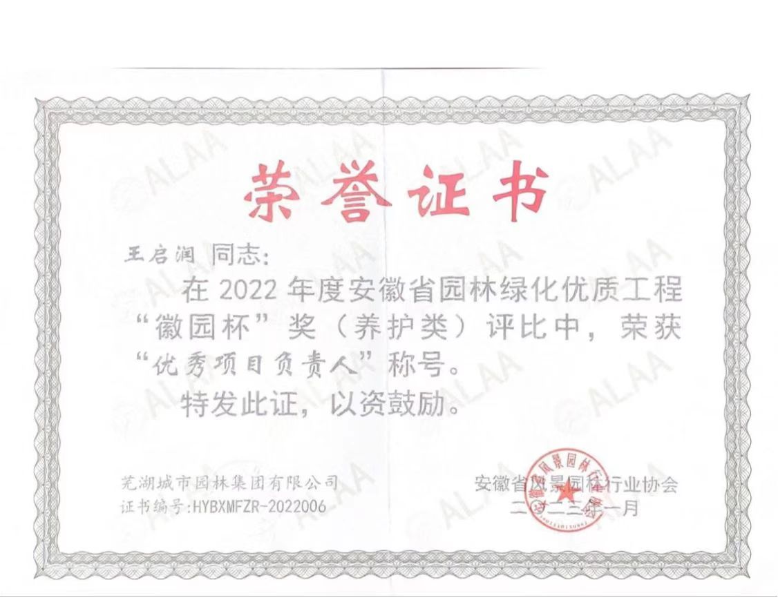 近日,蕪湖城市園林集團承建的夢(mèng)溪路站周邊道路品質(zhì)提升工程項目、南陵縣城市出入口一期及街頭小景綠化提升工程,榮獲“2022年度安徽省市政工程優(yōu)質(zhì)獎”;承接的蕪湖市市管公園養護工程喜獲安徽省園林綠化優(yōu)質(zhì)工程“徽園杯”養護類(lèi)金獎,王啟潤同志榮獲“優(yōu)秀項目負責人”稱(chēng)號。
