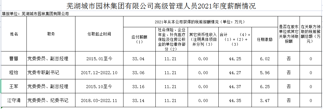 2021年度蕪湖城市園林集團企業(yè)負責人薪酬披露