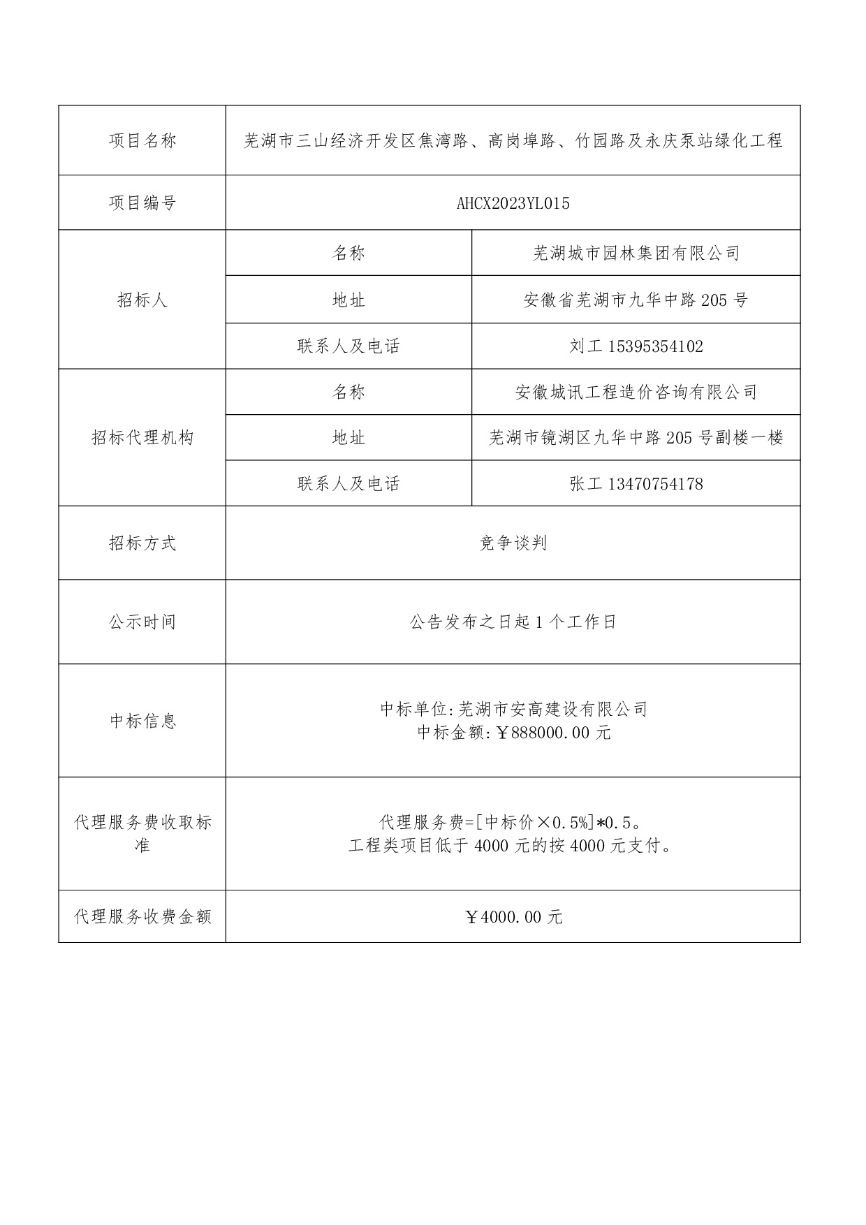 蕪湖市三山經(jīng)濟開(kāi)發(fā)區焦灣路、高崗埠路、竹園路及永慶泵站綠化工程中標結果公...