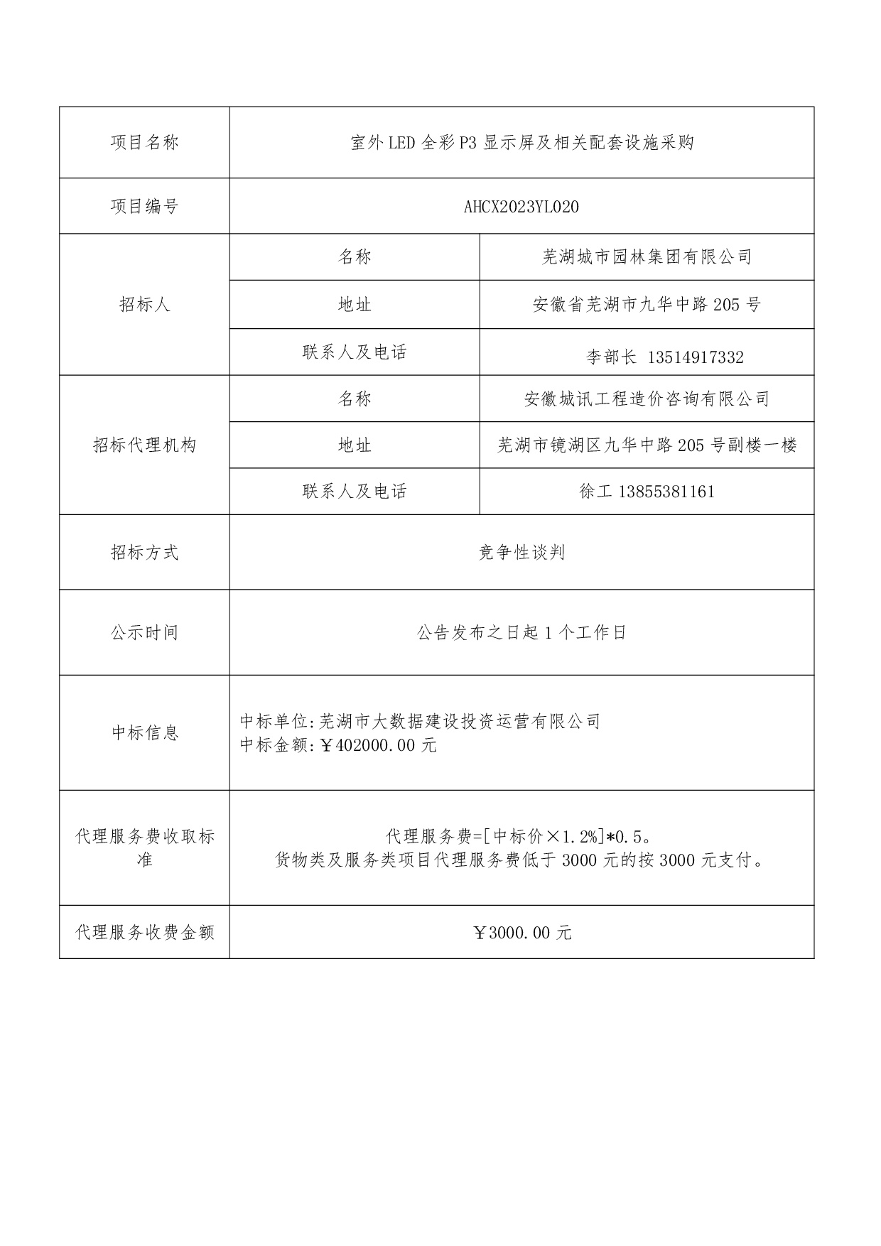 室外LED全彩P3顯示屏及相關(guān)配套設施采購中標結果公示