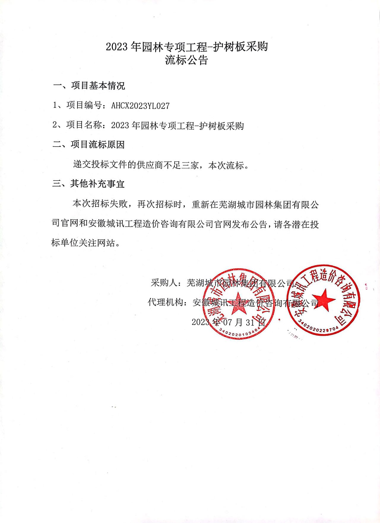 2023年園林專(zhuān)項工程-護樹(shù)板采購流標公告