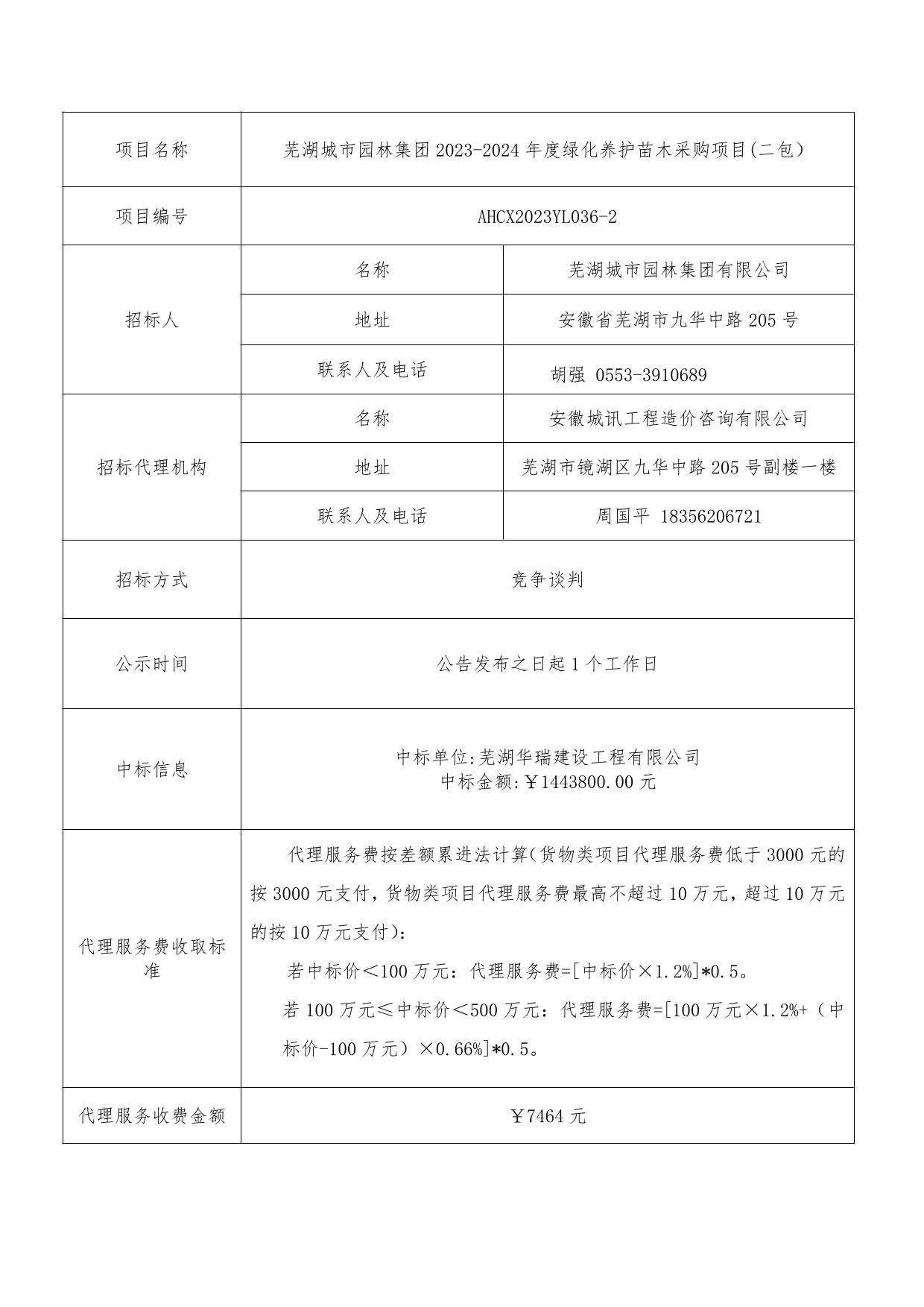 蕪湖城市園林集團2023-2024年度綠化養護苗木采購項目(二包)中標結