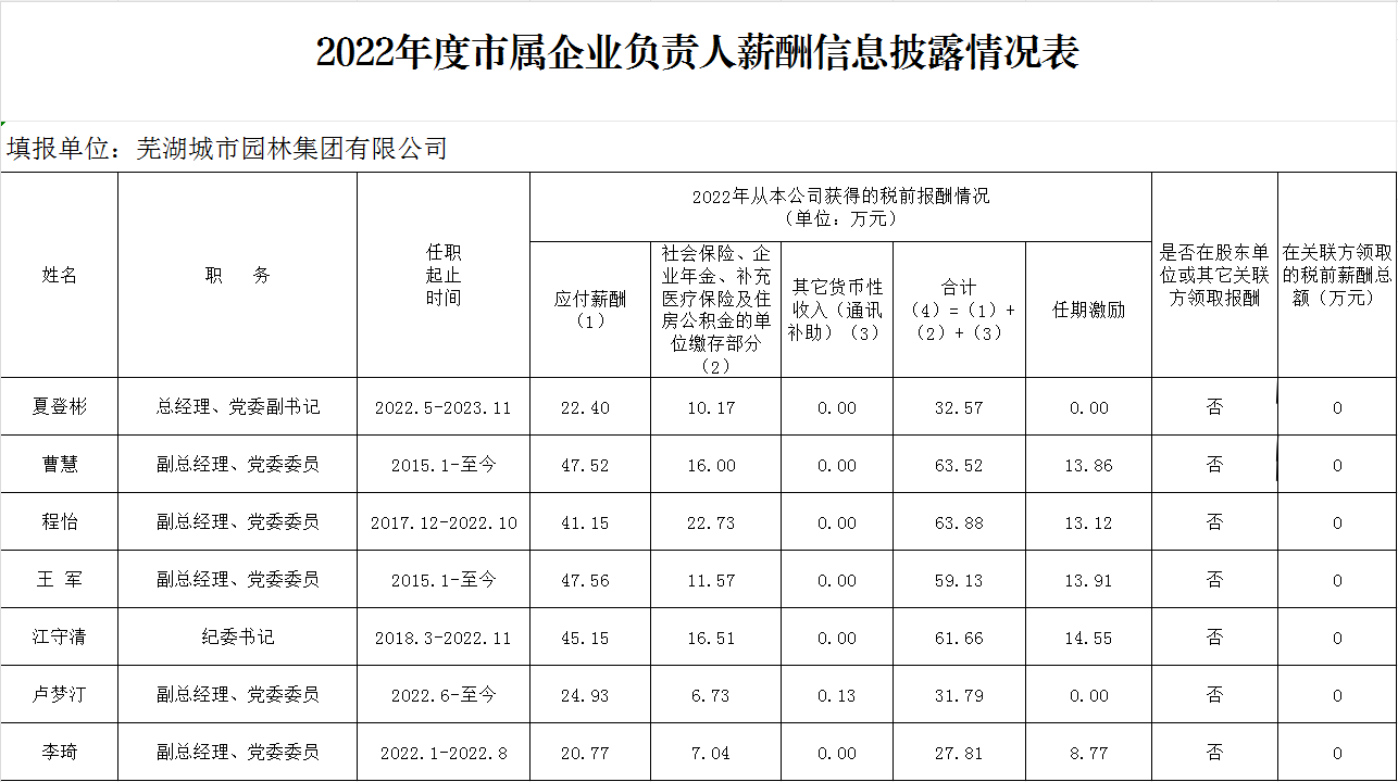 2022年度蕪湖城市園林集團有限公司領(lǐng)導人員薪酬信息披露表