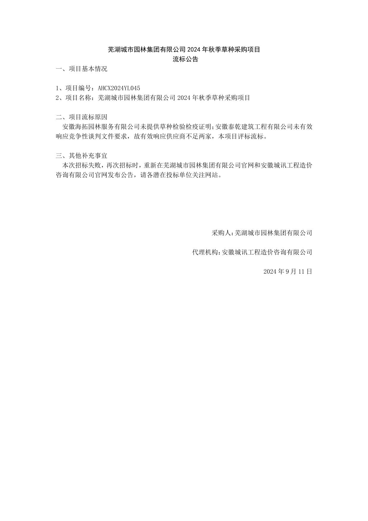 蕪湖城市園林集團有限公司2024年秋季草種采購項目流標公告